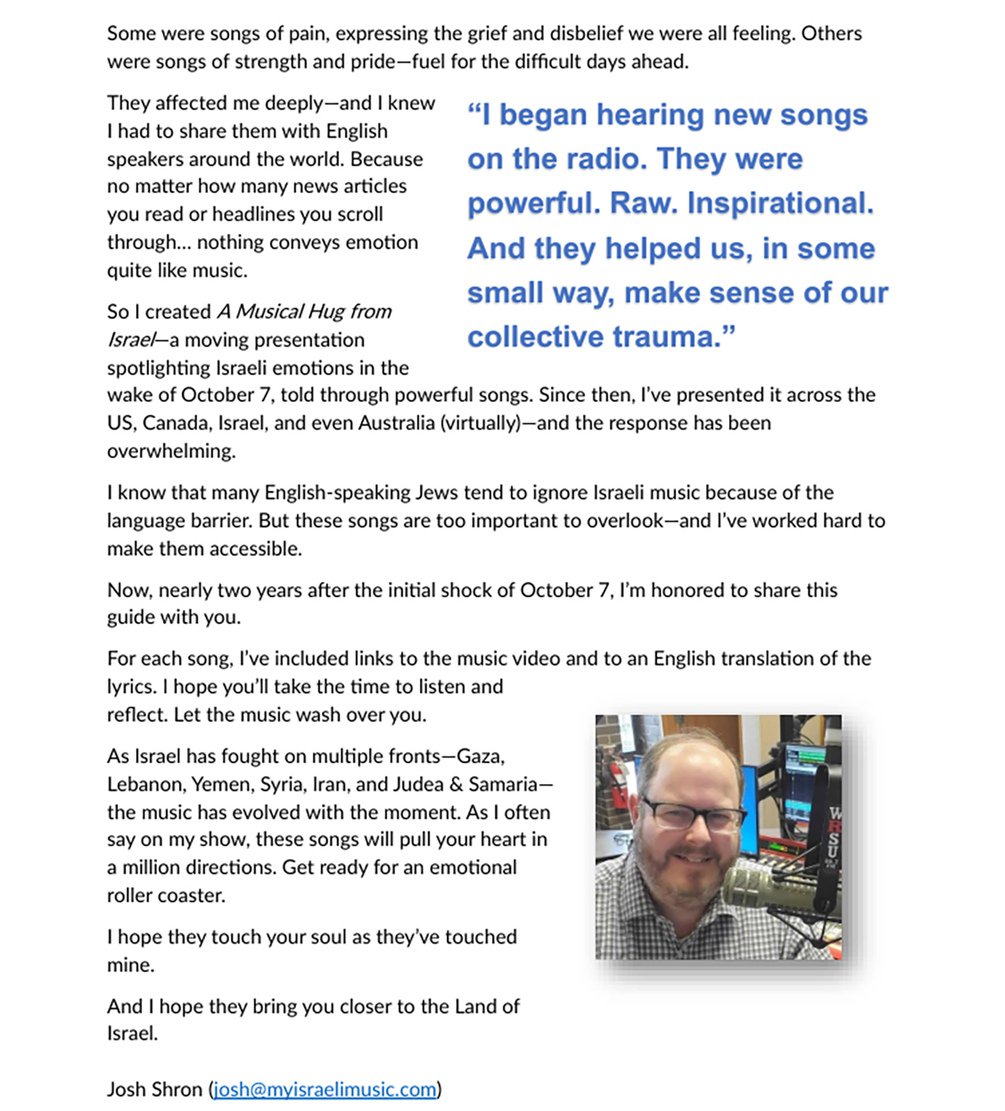 "Knowing Josh, hearing his voice for years, as I started to read, I had the shivers as I could hear Josh’s voice and feel his soul.  Josh's words on every page are raw, yet tender, embracing the scope of the hellish pain, yet also tempered with hope and resilience.  So much thought was put into this, as every page had new insights, new vocabulary.  The tears and feeling of pain through the songs are so cathartic as we all continue to process our relationship to Israel and to Israelis in the aftermath of October 7.  This ebook is an expression of an incredible amount of work and love."