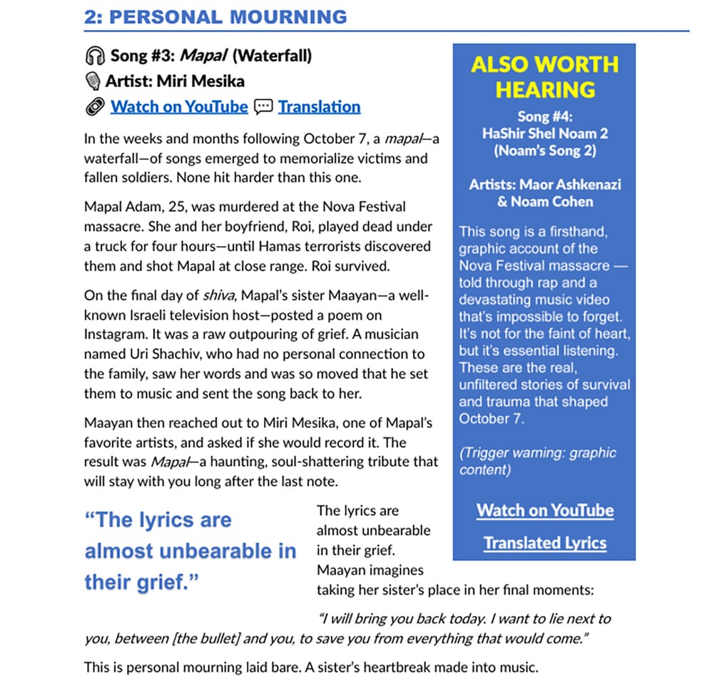 "Knowing Josh, hearing his voice for years, as I started to read, I had the shivers as I could hear Josh’s voice and feel his soul. Josh's words on every page are raw, yet tender, embracing the scope of the hellish pain, yet also tempered with hope and resilience. So much thought was put into this, as every page had new insights, new vocabulary. The tears and feeling of pain through the songs are so cathartic as we all continue to process our relationship to Israel and to Israelis in the aftermath of October 7. This ebook is an expression of an incredible amount of work and love."